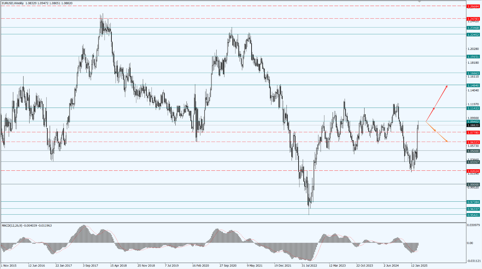 유로가 1.0940선을 안정적으로 돌파할 경우, 추가 상승 가능성이 열리며 1.1143과 1.1484선에서의 저항을 확인해야 합니다.
