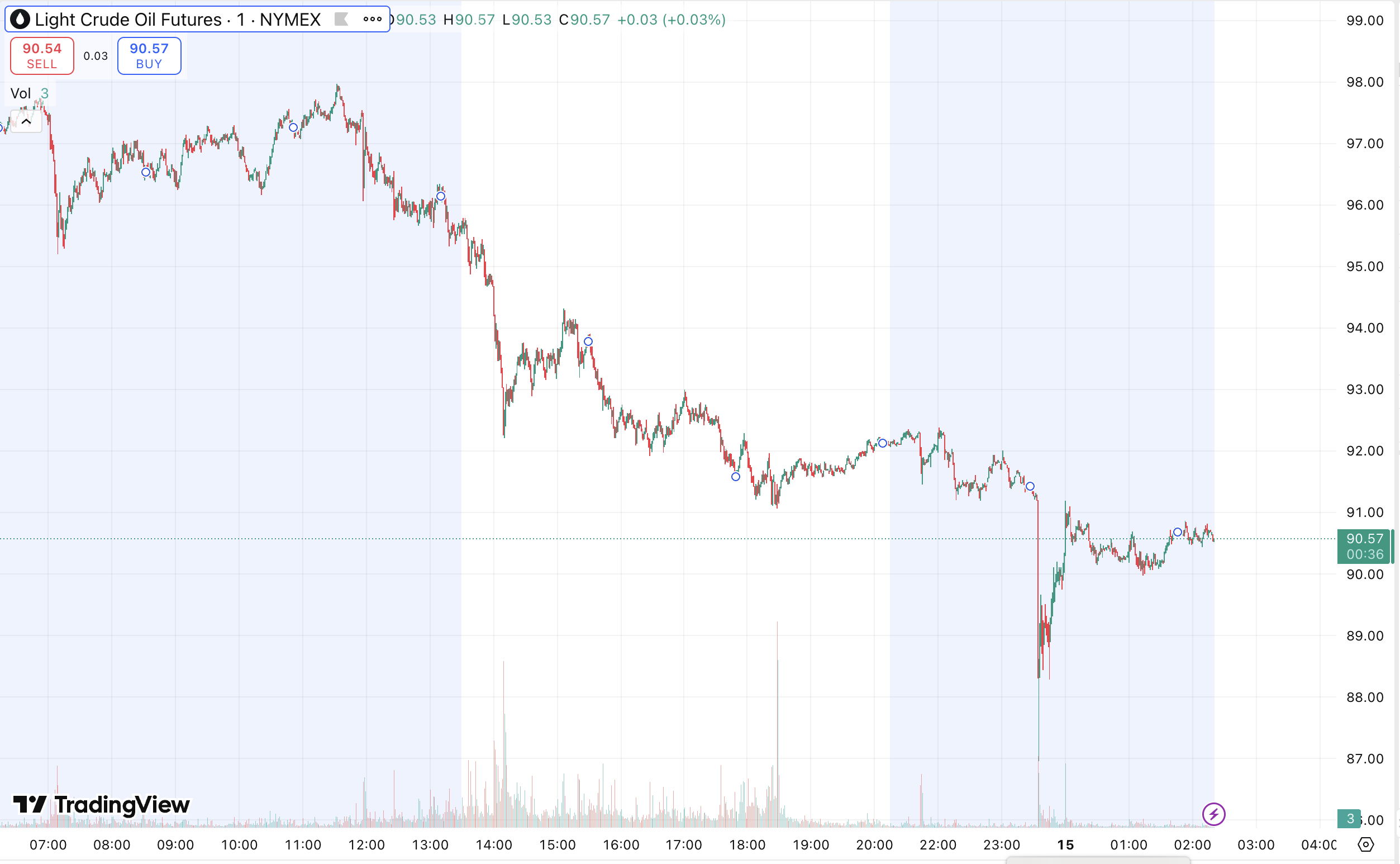 油价周二显著下跌,布伦特原油期货收跌 4.6% 报每桶 94.79 美元,美原油期货重挫 7.87% 报 91.20 美元,主要因市场寄望伊朗与美国、以色列重启谈判以结束导致霍尔木兹海峡关闭的冲突。