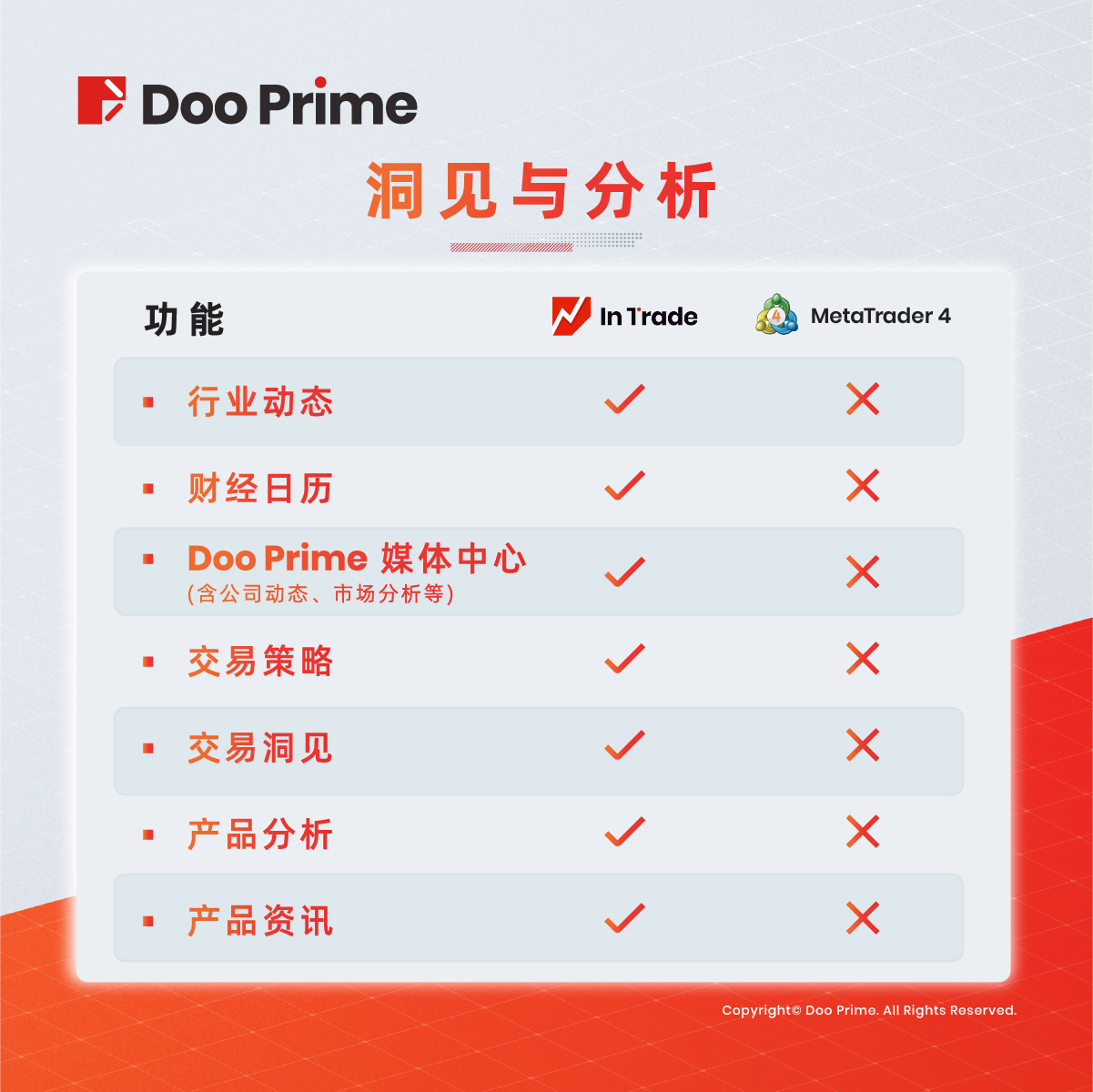 Doo Prime InTrade 在功能体验方面略胜一筹。Doo Prime InTrade 用户可以在应用程序中阅览所有洞见和分析,从行业动态、经济日历到 Doo Prime 最新发布和策划的市场评论都可以帮助用户更准确地把握市场。