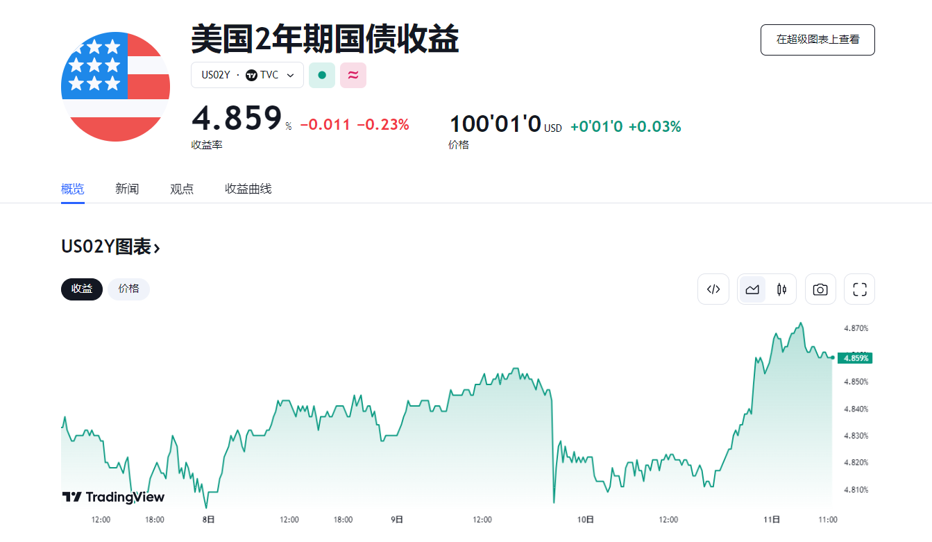 10 日,两年期美债收益率涨 5.01 个基点,刷新日高至 4.865%,全周累计上涨 4.95 个基点。美国 10 年期基准国债收益率上涨 4.72 个基点,报 4.5003%,全周累计下跌 0.74 个基点。
