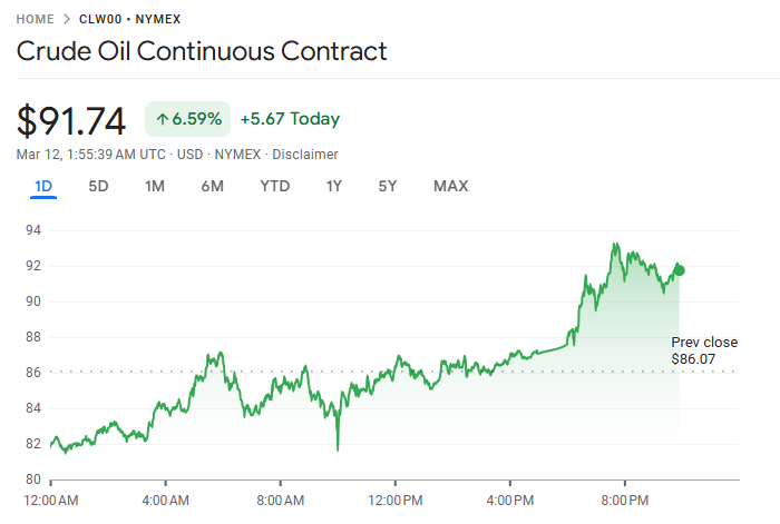 WTI 原油期货一度上涨 6.6%,至每桶 93.01 美元,继周三近 5% 的涨幅后连续第二日上涨。报道称,伊朗已通过地区中间方表明,若要停火,美国必须保证自身及以色列未来不会再对伊朗发动袭击。由于这一条件被认为难以被华盛顿接受,市场普遍下调对战争迅速结束的预期。