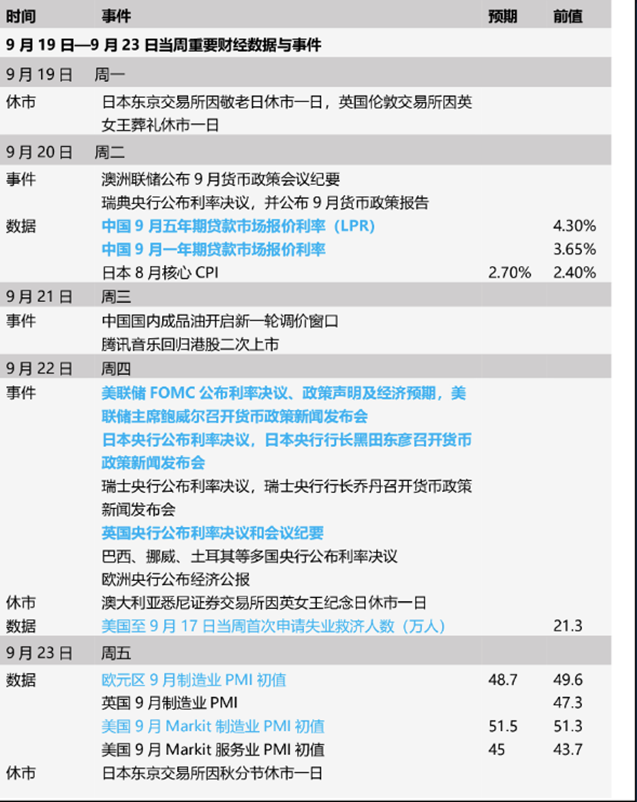 9 月 20 日(周二):澳洲联储公布 9 月货币政策会议纪要、瑞典央行公布利率决议并公布 9 月货币政策报告、欧洲央行管委穆勒发表讲话;