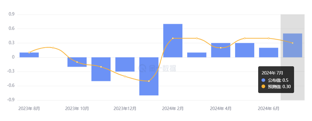 中国 7 月 CPI 同比增至 0.5%