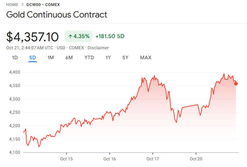 现货黄金盘中最高上涨 3.1%,突破每盎司 4381 美元,随后回落至约 4355 美元,涨幅收窄至 2.5%。纽约 12 月期金合约一度升至每盎司 4398 美元创纪录高位,最终收报 4359.4 美元,上涨 146.1 美元,涨幅约 3.5%。