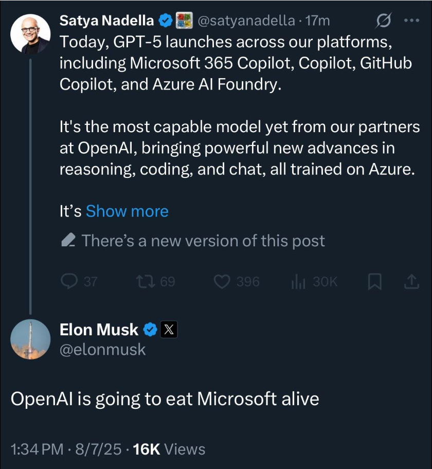 行业动态 | OpenAI 發布 GPT-5 并全面登陆微软生态系统,马斯克警告﹕微软会被 OpenAI 生吞