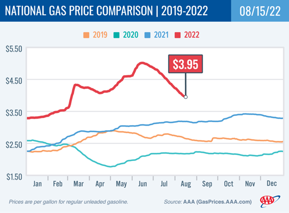 8 月 15 日,全美汽油平均价格为 3.95 美元/加仑,较一周前下降 10 美分,较一个月前下降 62 美分,较一年前上涨 77 美分。
