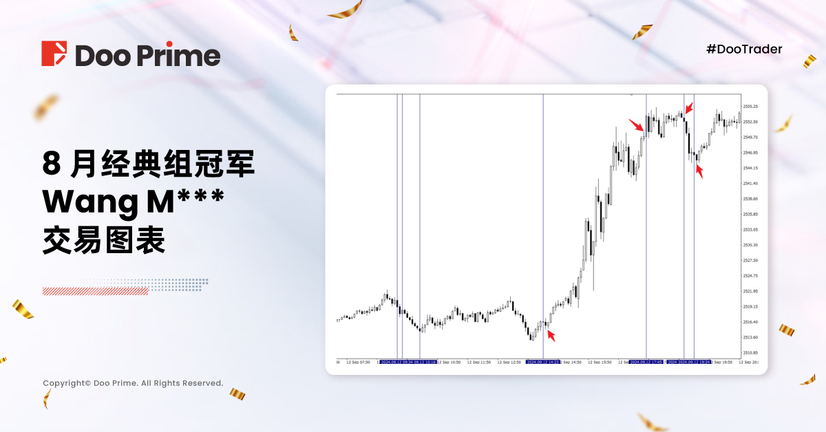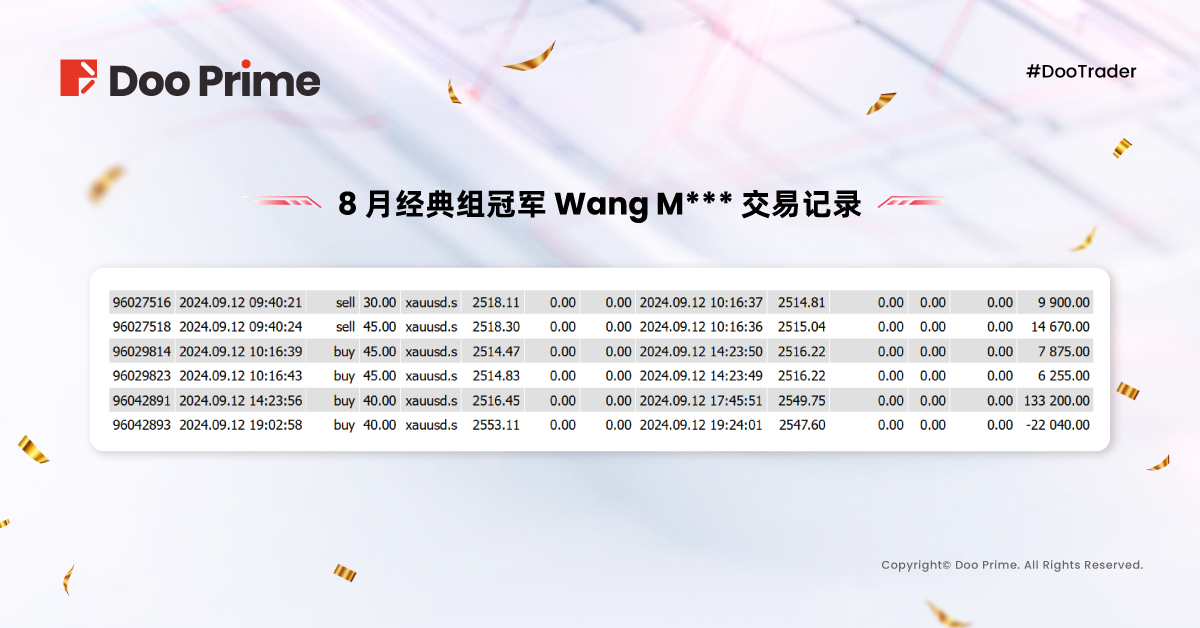 Wang M**** 先以 MT5 账户参赛大师组,并在完成交易三周之后,再使用一个 MT4 账户报名经典组。这位选手在经典组的 42 笔交易、合计 665 手的交易手数中,实现了将近 12 倍收益率的雄厚利润,一举拿下 2024 #DooTrader 慈善杯 8 月赛事的经典组冠军!