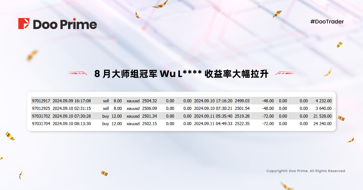 正是凭借稳定且优异的胜率,且随着交易本金的不断增加,Wu L**** 仅仅通过两笔订单,成功大幅提升了收益率。尽管数据公布期间为行情波动增加了不确定性,但他依然做出了正确的判断,并在 9 月 11 日成功逆袭,跃居大师组排行榜前列。