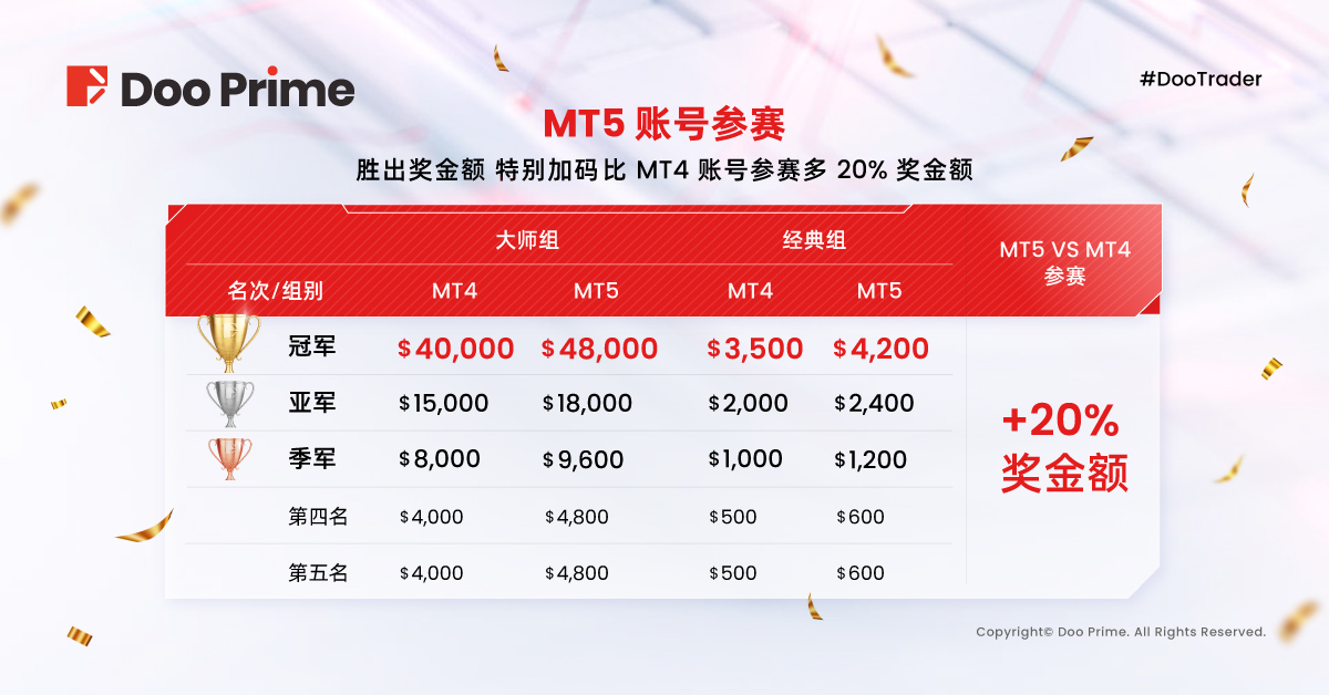 本届 2024 #DooTrader 慈善杯交易大赛带来了前所未有的惊喜——使用 MT5 账号参赛的选手,将有机会获得额外 20% 的奖金!这一特别福利旨在鼓励参赛者体验功能更强大、执行效率更高的 MT5 专业交易平台。快来把握机会,提升您的交易体验与竞争优势!>>>>>>立即点击报名参加!
