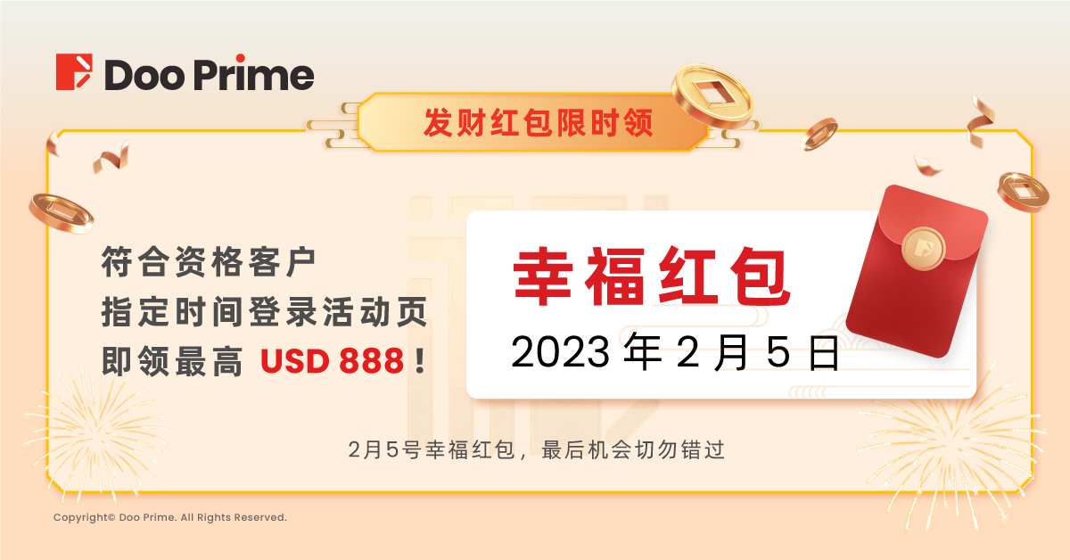 新春伊始,Doo Prime 已经为全球客户预备了海量福利,其中包括深受广大客户欢迎和支持的 “欢 Doo 新年全球大抽奖” 活动。 在新春佳节的尾声,我们将继续派发最后一波 “发财红包限时抢” 活动。希望趁着春节结束之前,把更多奖金福利送给您!也祝全球投资者 “万事如意过好年,玉兔迎春旺全年”。