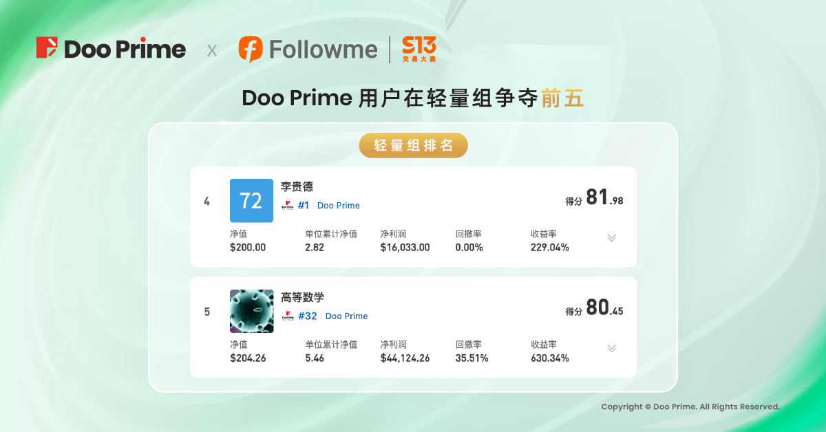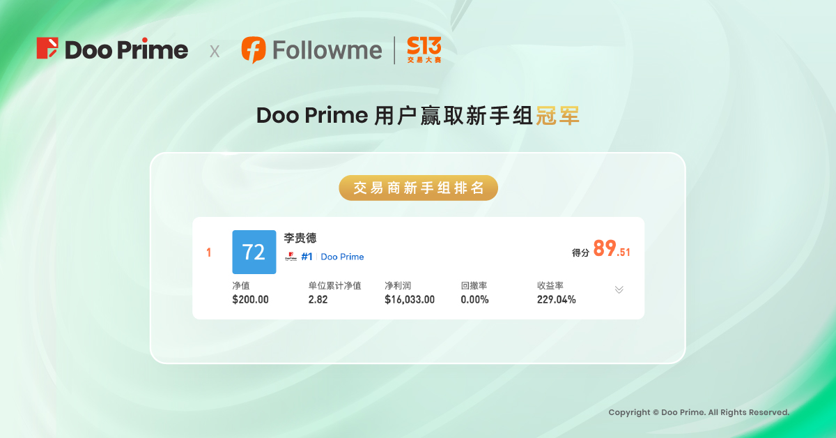 FOLLOWME S13 交易大赛收官,Doo Prime 选手喜赢新手组冠军!