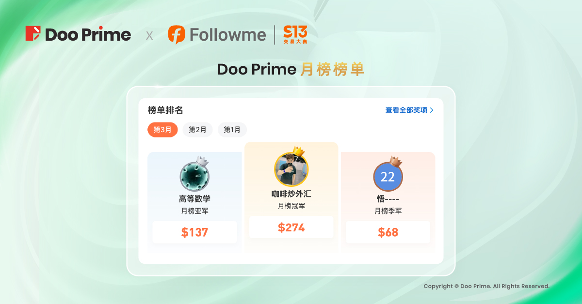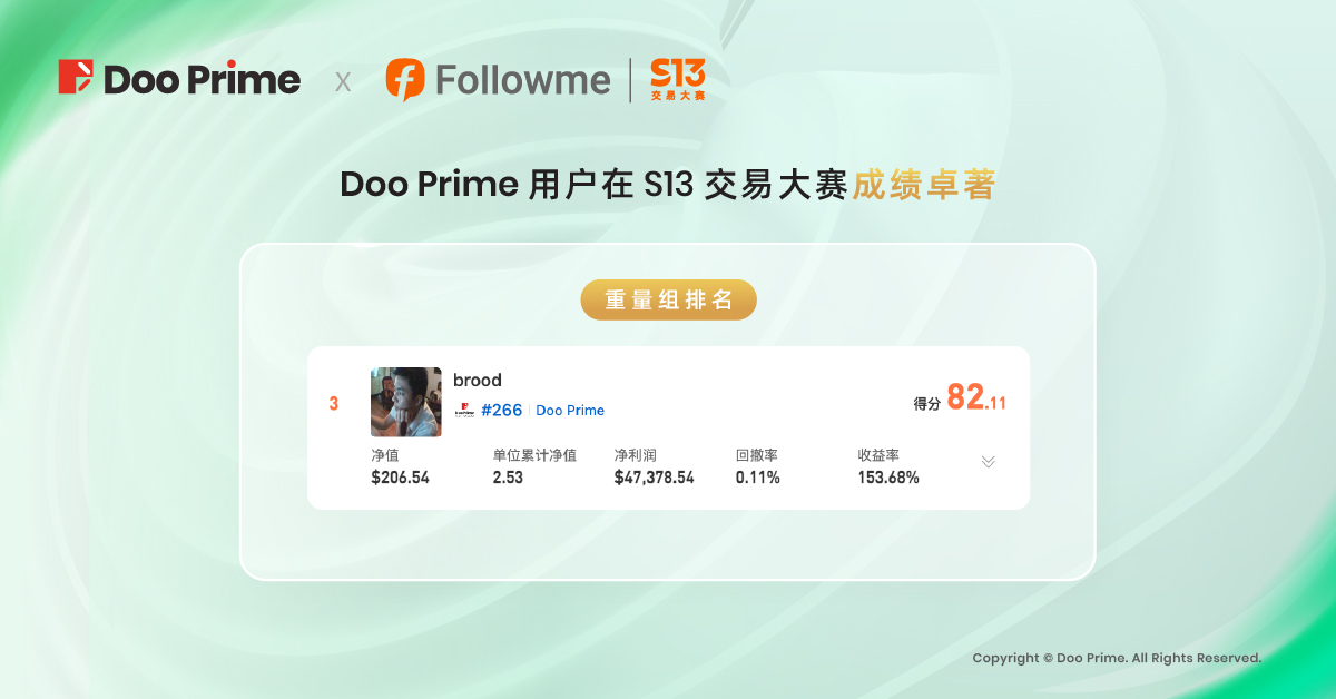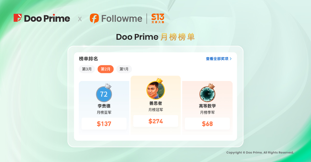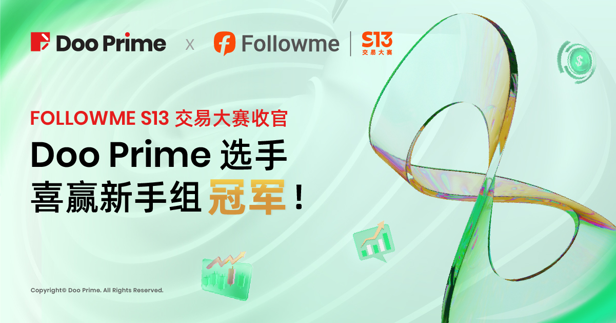 尽管 S13 交易大赛已正式落下帷幕,但投资者的交易新征程才正要启航。未来,Doo Prime 将一如既往,致力于为全球客户提供灵活高效的交易服务,助力投资者在交易大赛中再创巅峰!Doo Prime 还将携手 Followme 一同为广大交易员提供更多活动福利和奖励,敬请留守 Doo Prime 动态!