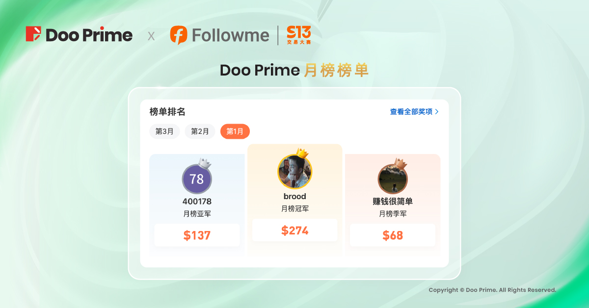 在 FOLLOWME S13 交易大赛的第 1 月,总榜重量组季军 @brood 以 89.30 的高分,荣获 Doo Prime 月榜冠军,享有价值 274 美元的京东 e 卡奖励;@400178 整体表现以微分之差 89.24 位居第二,而 @赚钱很简单 为第 1 月 Doo Prime 月榜季军,两位分别获得价值 137 美元和 68 美元的京东 e 卡。