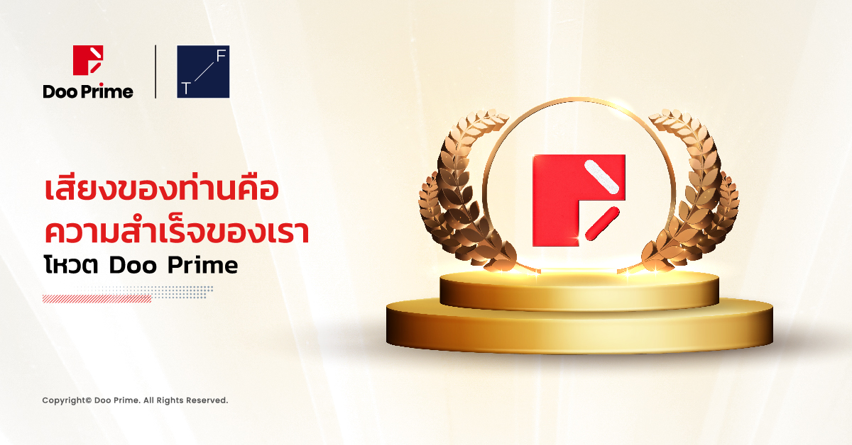 ร่วมกันช่วยทำให้ Doo Prime ทำตามความฝันให้สำเร็จ ด้วยการโหวตให้ Doo Prime ได้รับรางวัล เพื่อให้เราได้ประสบความสำเร็จไปพร้อมกัน โปรดสละเวลาสักครู่เพื่อโหวตให้เราที่ www.tradersawards.com ทุกเสียงของท่านจะสร้างการเปลี่ยนแปลงที่ยิ่งใหญ่ให้เรา